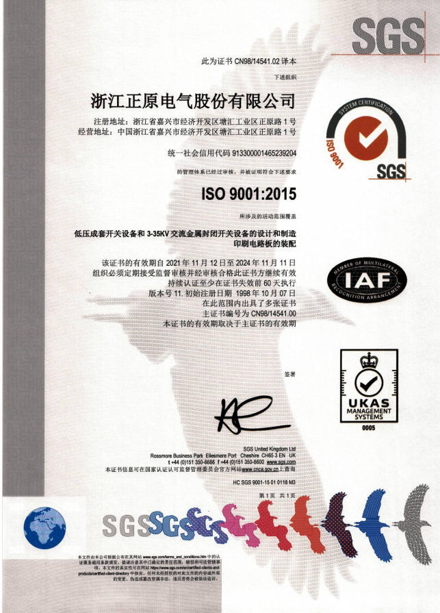 正原電氣已獲體系認證:已通過ISO9001、ISO14001、ISO45001管理體系認證 。